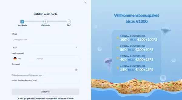 Die Kontoerstellung ist auf Schnelligkeit ausgelegt, und Sie können die wichtigsten Schritte am Desktop oder im mobilen Browser abschließen. Nach der Registrierung können Sie Einzahlungen, Limits und Promo-Angebote in Ihrem Profil verwalten. Für Kontosicherheit und um reibungslosere Auszahlungen zu unterstützen, können wir eine Verifizierung vor der ersten Auszahlung oder wenn es unsere Prüfungen erfordern, anfordern.